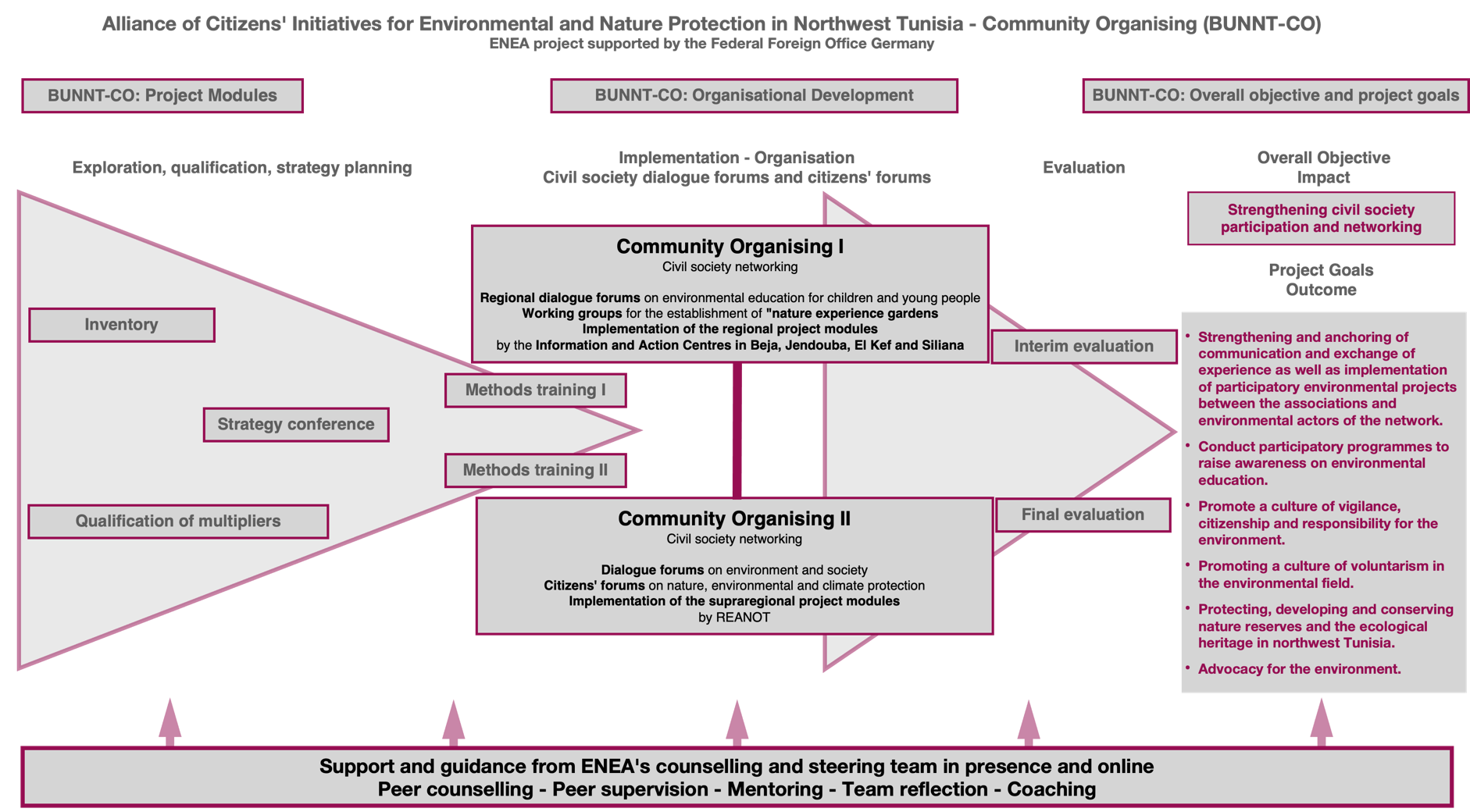 The networking of the target group of environmental protection initiatives in four governorates in northwest Tunisia must be enabled to work productively with social stakeholders by providing qualifications and skills, especially for multipliers, pioneers and all "driving forces" with the help of the democracy-promoting problem-solving and moderation concept "Community Organising".