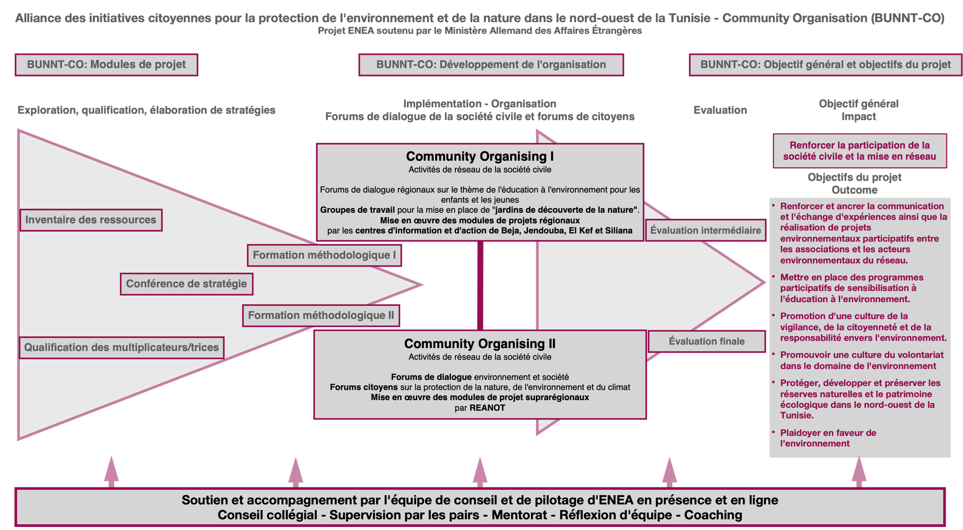 ENEA contribue surtout par l'engagement bénévole d'une équipe de pilotage et de conseil à l'accompagnement, au soutien, au co-training, à l'empowerment ainsi qu'au conseil collégial, à la supervision par les pairs, à la réflexion d'équipe ainsi qu'au coaching des partenaires tunisiens, et ce lors des phases de présence ainsi que lors des réunions virtuelles.