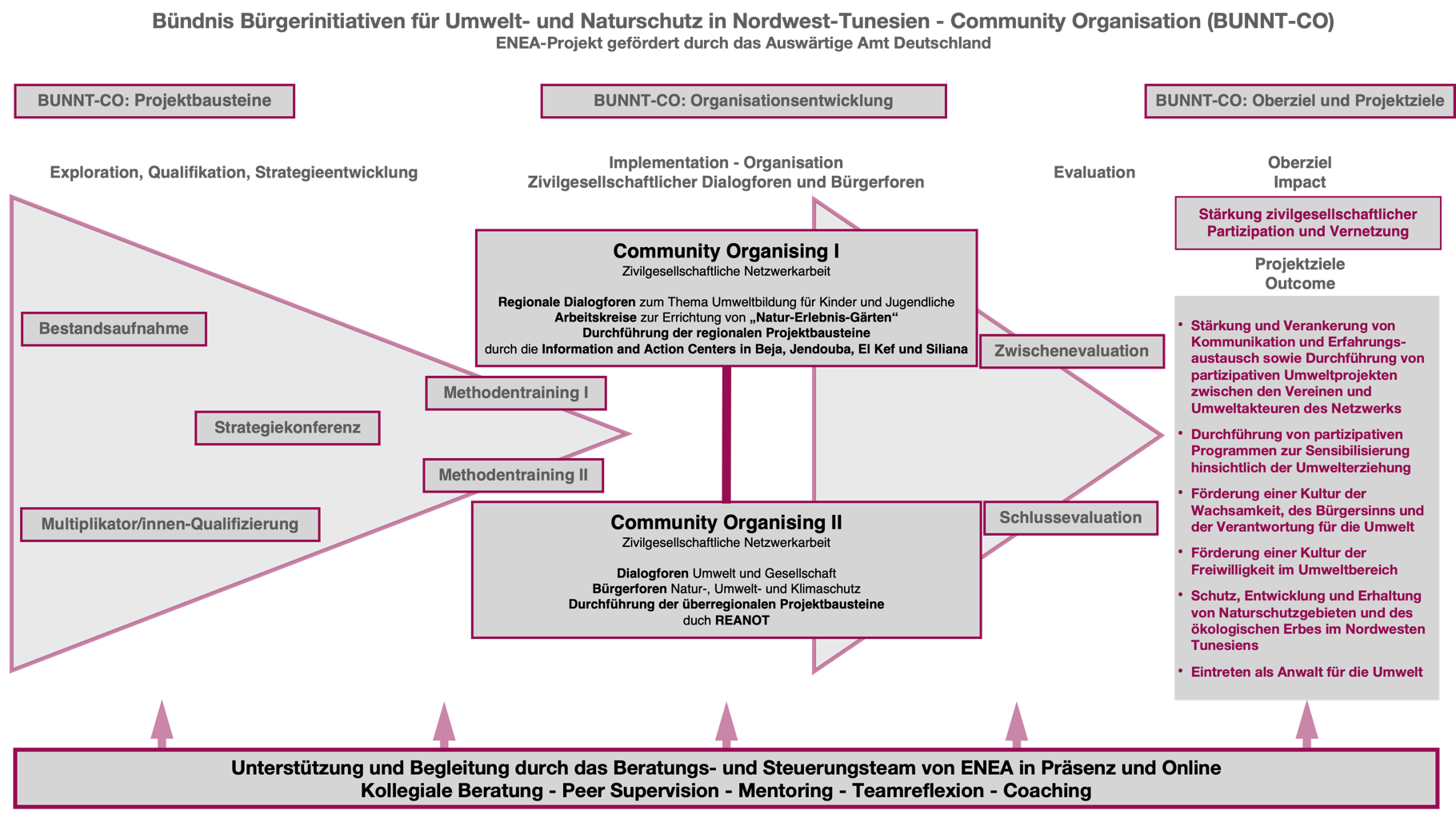ENEA trägt vor allem mit dem ehrenamtlichen Einsatz eines Steuerungs- und Beratungsteams zur Begleitung, Unterstützung, Co-Training zum Empowerment sowie zur kollegialen Beratung, zur Peer-Supervision, zur Team-Reflexion sowie zum Coaching der tunesischen Partner/innen bei, und zwar in den Präsenzphasen sowie in virtuellen Meetings.