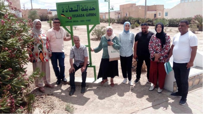 Dans la ville de J'rissa, touchée par la désertification et la destruction de la nature par l'exploitation minière, une oasis verte a été créée avec la participation des habitants* locaux. Ce sont eux qui s'occupent de l'entretien et de l'arrosage des plantes. Ce jardin a pour but d'offrir aux familles et aux enfants, dans un paysage aride, un bel endroit naturel pour se réunir et profiter de l'environnement. La plantation d'arbres de grande taille a permis de prévoir de l'ombre pour les étés chauds. L'importance de la nature est expliquée aux familles par des panneaux d'information, mais aussi par le simple effet de la verdure.